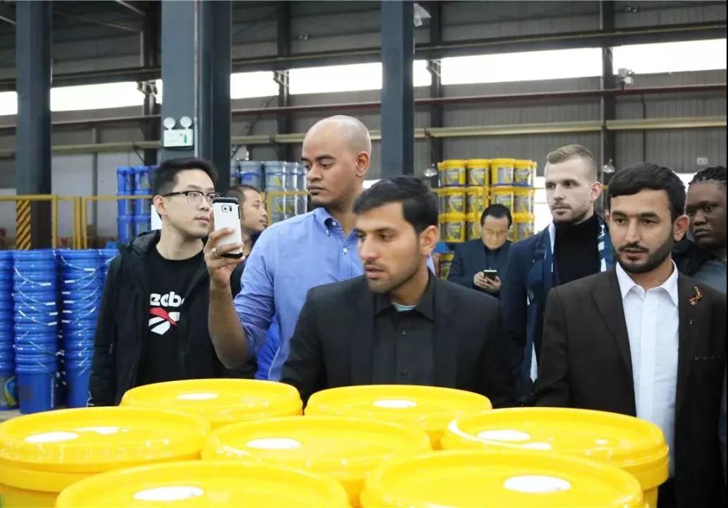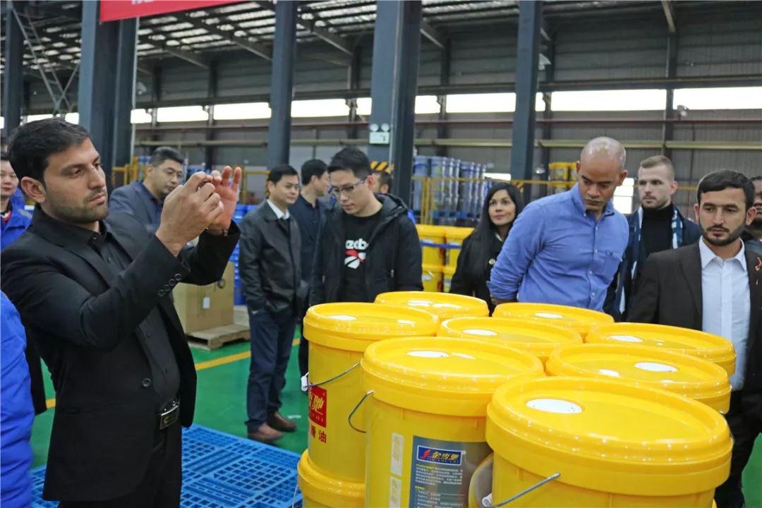 考察团一行在田总的陪同下,参观了金雪驰年产能15万吨高端润滑油生产车间。从产品的原料管控、调和、灌装到产品检测、贴标、包装、装箱,考察团成员们看到了一桶桶金雪驰润滑油诞生的全过程,生产车间处处体现了科技、智能和节能。