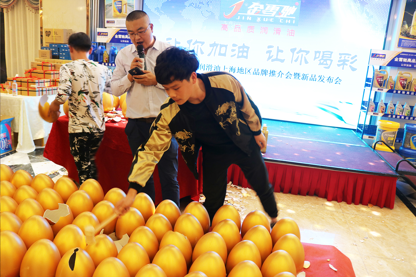 同样热闹的还有台上一轮盖过一轮的砸金蛋抽奖活动。主持人李阳激昂兴奋地播报客户砸金蛋获得的一个个奖品,所有订货的客户都欢喜而激动地拿到了奖品。