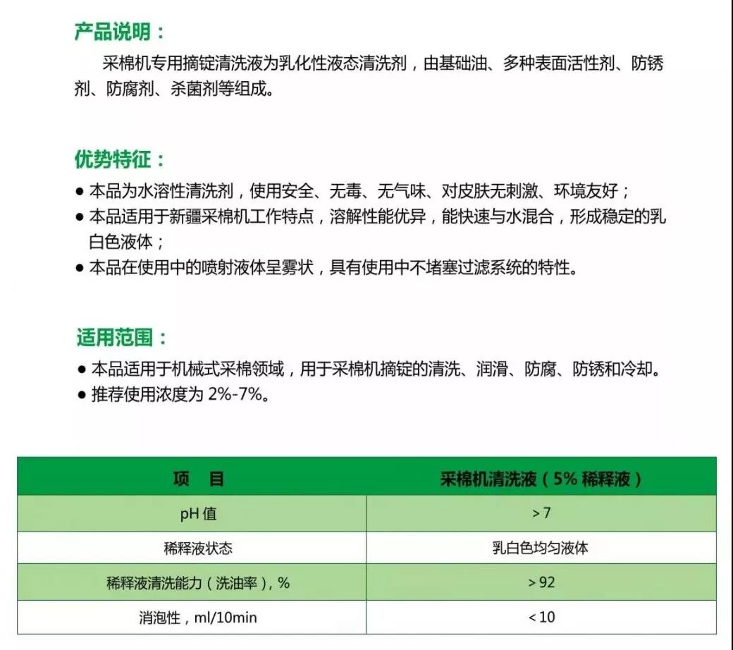 采棉机的工作时间较为集中,作业温度高,机器长时间连续作业,各零部件之间磨损大,棉农们迫切需要可靠的润滑产品和精准的技术支持来保障采棉效率。针对采棉机的特殊结构及使用要求,新疆金雪驰科技股份有限公司研发并推出了采棉机专用摘锭润滑脂、采棉机专用摘锭清洗液和采棉机各部位需要的润滑剂,并为广大采棉机用户提供全面的润滑解决方案和技术服务。