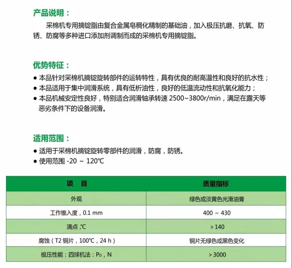 采棉头由精准设计和制造的大量零件构成,采棉头工作过程中,各零部件之间转速快,有大量金属与金属之间的接触,为了确保高质量的工作性能,需要使用高性能的采棉机摘锭润滑脂。