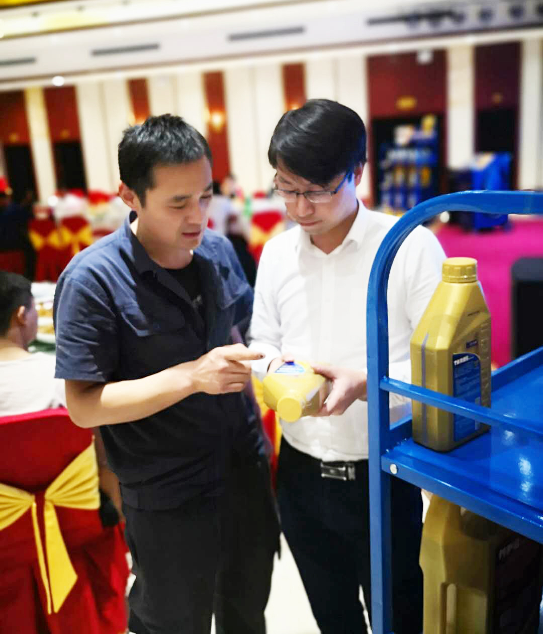 金雪驰科技(马鞍山)有限公司区域经理赵凌向现场客户展示了金雪驰的全新产品T族特级S、变速箱油、发动机清洗剂等,并演示了金雪驰等量智能交换机。在他的讲解下,与会客户对金雪驰的T族特级S、变速箱油等产品表现出浓厚的兴趣。