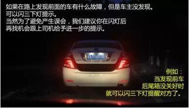 开车在路上时,要是发现有人对你闪3下大灯时,则是对方在提醒你,你的车子有问题,如后备箱没关好或车门没关好、漏水、漏油等。那你最好找个安全的地方停车检查检查了。