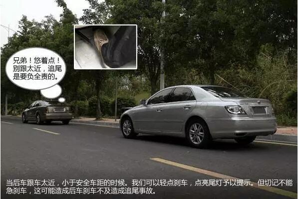 开车上路,如果你看到后车跟的距离太近时,这时向后车闪阶段性亮亮刹车灯,意思是提醒对方要保持安全车距。