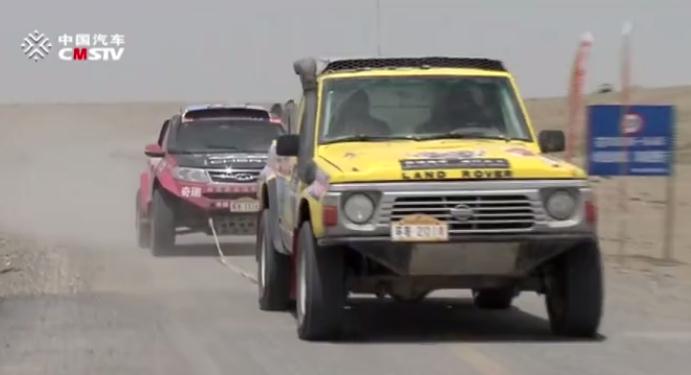 金雪驰新疆西域越野车队205赛车手张砚忠在行驶到距离终点40多公里的赛段时,发现157号赛车手朱志朋油箱没油被困沙漠,毅然将其拉至赛程终点。