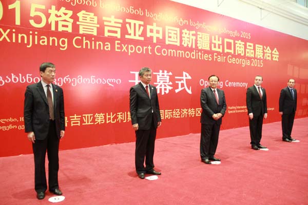 2015年第四届格鲁吉亚中国新疆出口商品展洽会于10月14日至17日在第比利斯举行,驻格鲁吉亚大使岳斌、格总理加里巴什维利、经济与可持续发展部长库姆西什维利、第比利斯市长纳尔马尼亚及新疆自治区主席雪克来提·扎克...