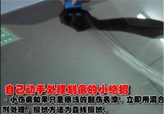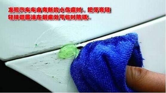 用普通的牙膏来处理。发现有新的小伤痕时,把牙膏轻轻抹圆圈涂在划痕处。下雨或洗车后,别忘了再涂一下。这样做一般可减轻划痕印记,也可以简单地起到隔绝作用,防止生锈,短期内没问题。特别是白色车漆,效果最为明显。