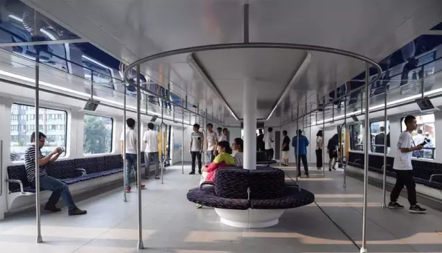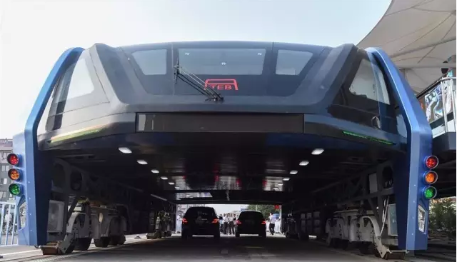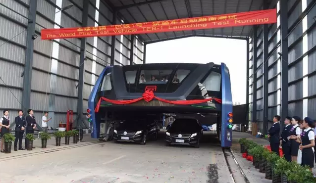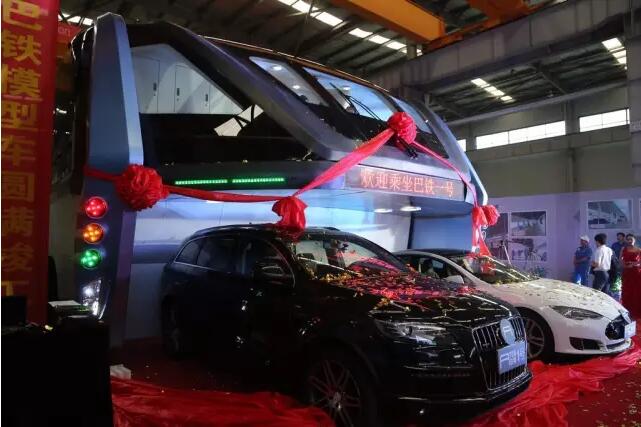 我国自行设计研制的“空中巴士”——巴铁1号试验车,在河北秦皇岛北戴河区启动综合试验。车厢长22米,宽7.8米,高4.8米,载客数300人。车厢内有多个液晶电视屏幕,还安装4个动态地图,下层镂空部分可行驶高度2米以下的车辆。