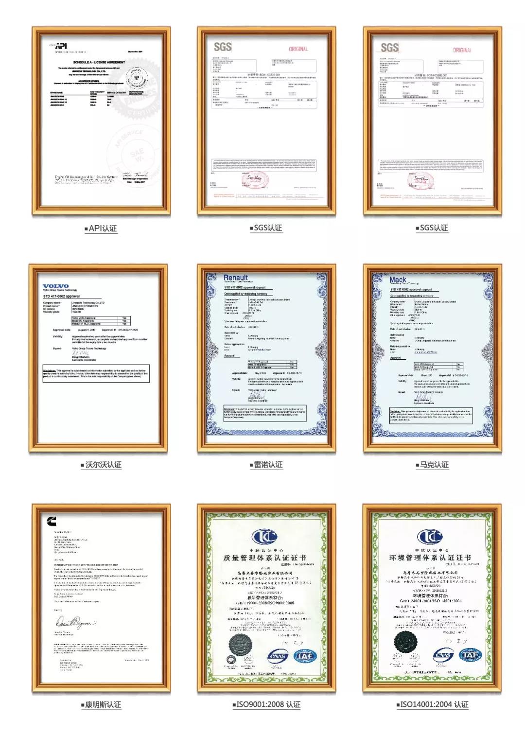金雪驰追求卓越,金雪驰润滑油除了满足一般的美国API认证,还获得了比API要求更为严苛的欧洲ACEA认证,同时取得了通过了瑞典沃尔沃、法国雷诺、美国康明斯、德国奔驰、宝马等多家知名汽车厂商认证。