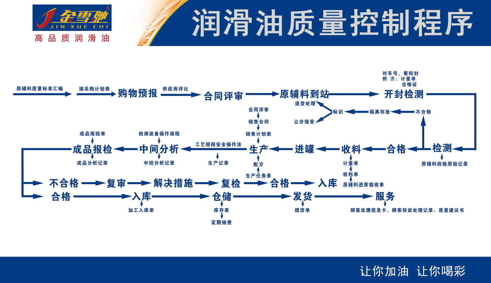 在生产设备上,金雪驰采用了国内最先进的润滑油脉冲调和技术,并结合ERP运营管理系统、DCS自动化控制系统、SMB同步计量系统、自动计量分装系统等实现生产的高度信息化集成,调和工艺,全面、高效、稳定。经调和生产的所有油品,必须经质检中心检测合格后,方可通过DCS控制系统送至成品罐。