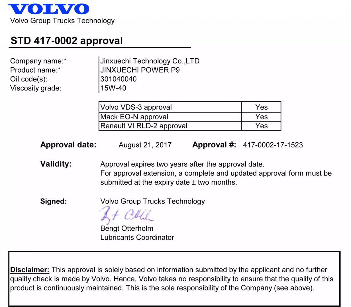 2017年8月21日,新疆金雪驰科技股份有限公司金雪驰品牌劲驰 POWER P9 15W/40柴油机油经过瑞典沃尔沃公司的严格测试,顺利获得该厂认证。