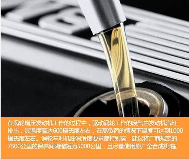 一般涡轮增压器在发动机转速达3500转/分钟时才会启动,并且快速提升直到6000转/分钟。而发动机转速越高,要求机油的抗剪切能力越强。只有这样,才能使得在高转速下机油的润滑能力不下降。因此,在选择机油时,应选择优质机油,比如高档全合成机油等。