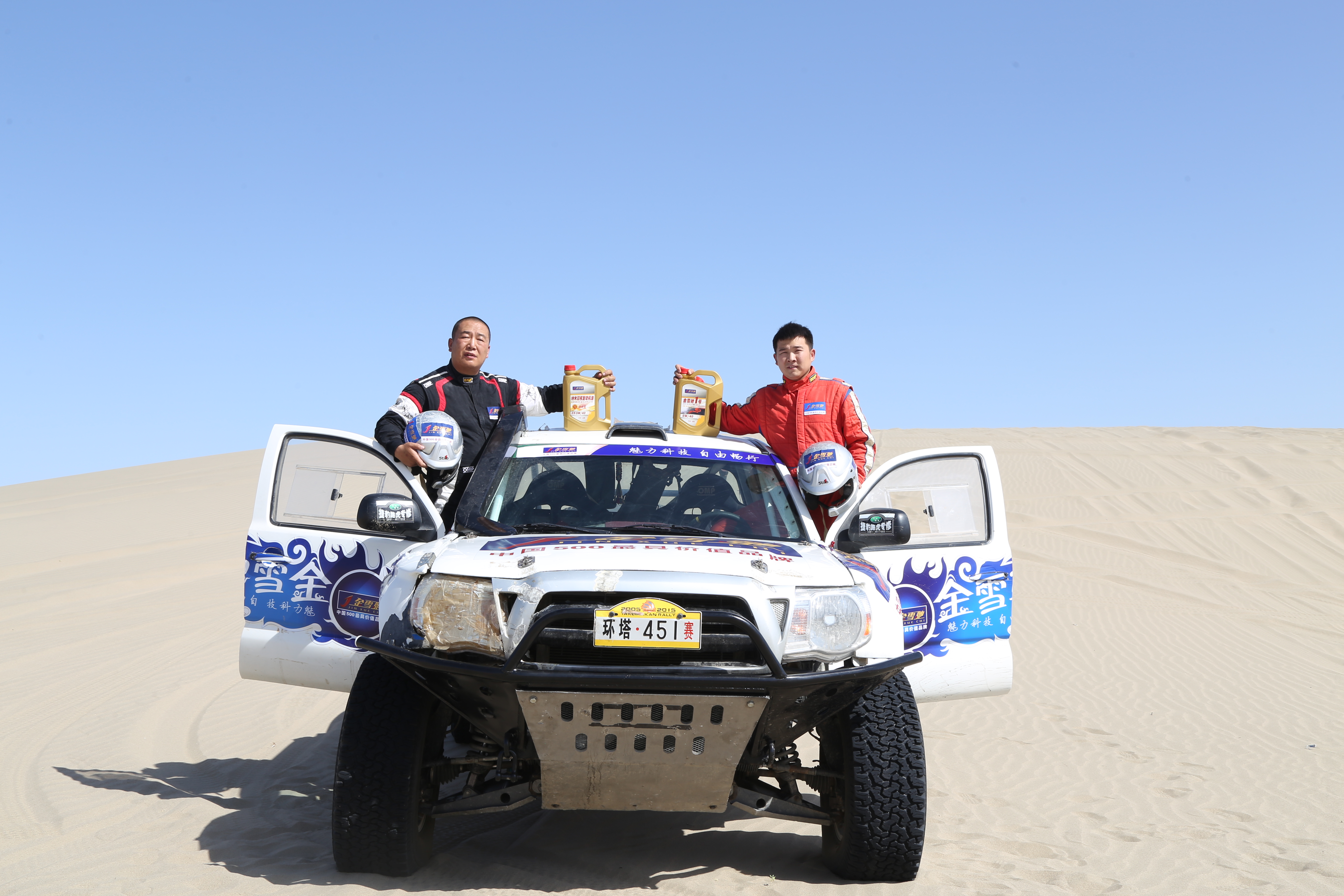 本次活动邀请荣获“2015中国环塔(国际)拉力赛”公开2组冠军的库尔勒承天车队金牌赛车手共同参与,自西向东,横穿塔克拉玛干大沙漠,所过荒漠,高温时段地表温度达七十多摄氏度,空气温度直逼六十摄氏度,这是对金雪驰润滑油高温性能的一大严苛考验。
