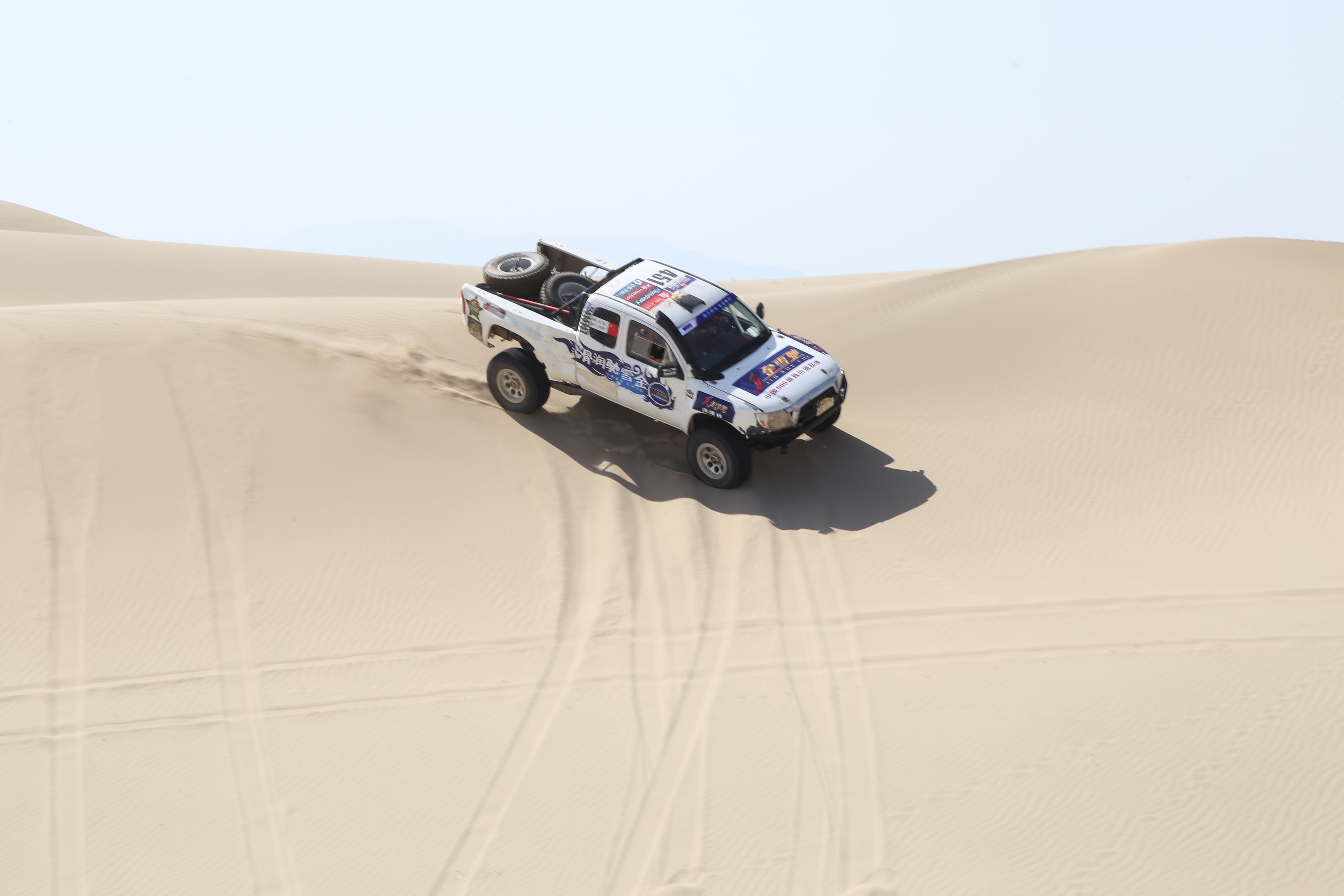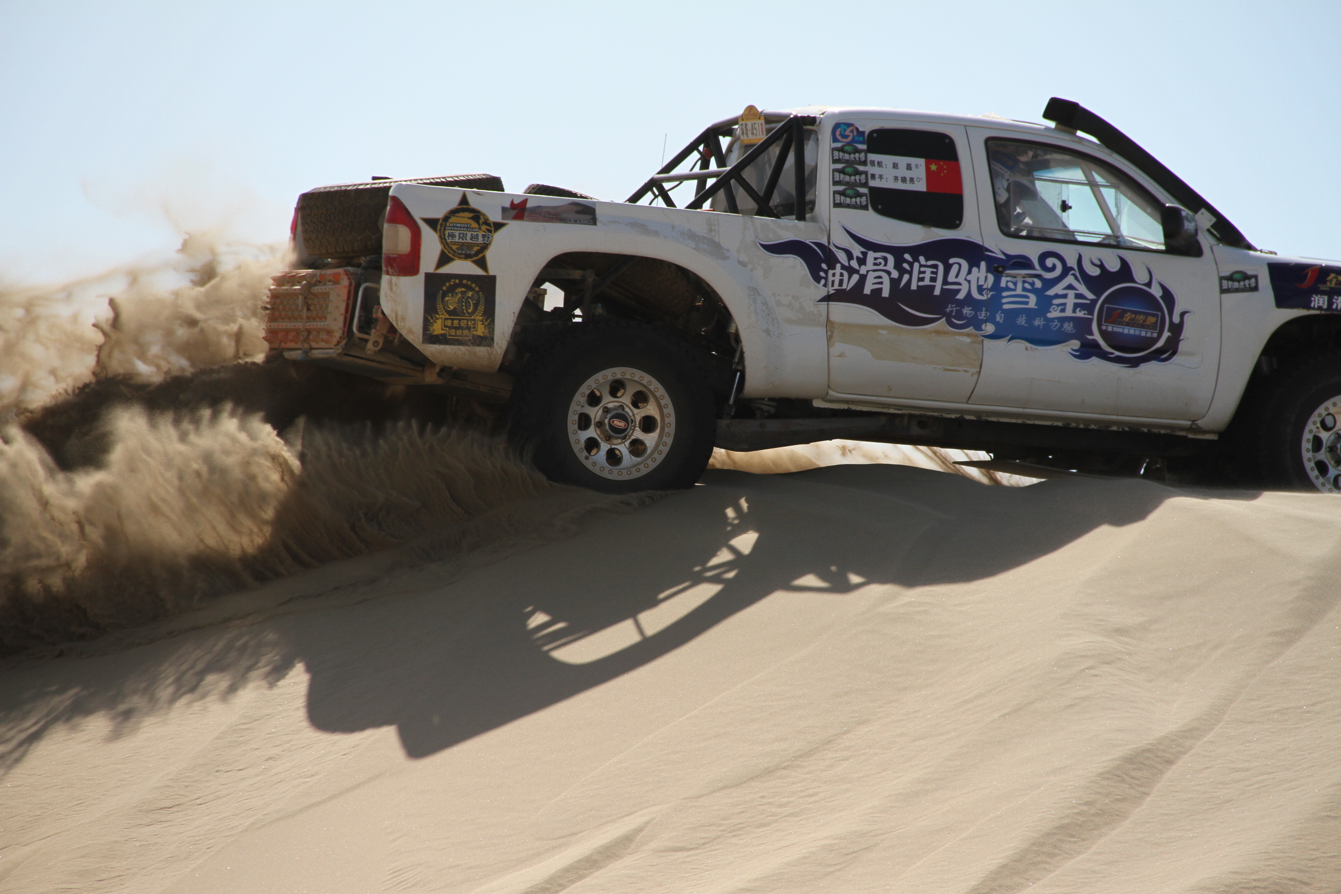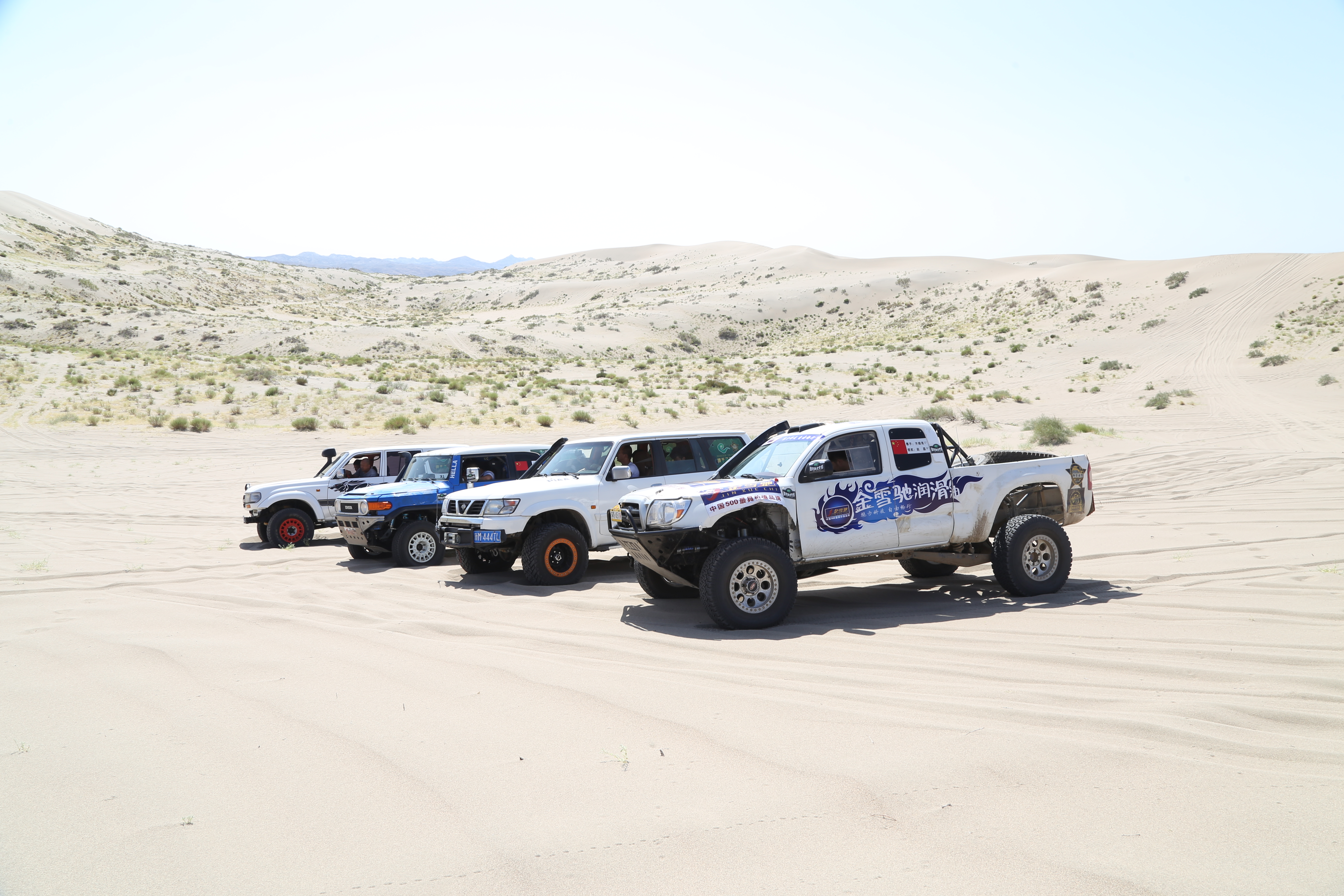 迎风面沙坡似水,背风面流沙如泻。承天车队赛车手和金雪驰工作人员一路历尽艰险横越沙漠,在大自然的严苛考验中,同时也见证了一番光怪陆离的戈壁幻景、神秘莫测的大漠奇观。大自然的沧桑变化在这里留下了严峻的一页,广袤的大漠,死寂的沙海,永远是灼热的黄色。仿佛大自然在这里把汹涌的波涛、排空的怒浪,刹那间凝固了起来,让它永远静止不动。沙漠处处热浪袭人,仿佛燃烧着熊熊火焰。这炙热的洗礼,这严苛的考验,堪称润滑油产品在极限环境下使用性能的试金石,亦充分且极致地体现了金雪驰润滑油的出色品质。