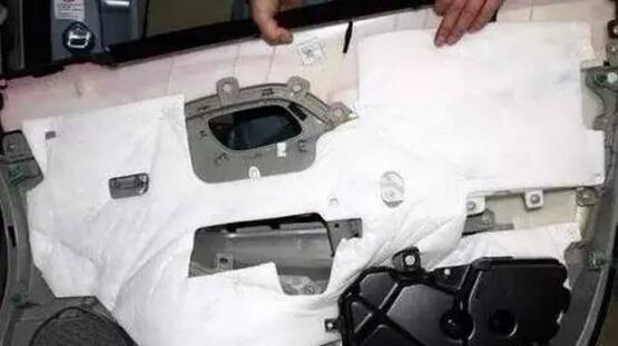 车门或车身内有许多地方都有填充物、隔音棉,以达到隔振降噪的目的。普通车门内几乎没有隔音棉,关门声难听,所以车主一般会在后期加装隔音棉。另外,在防水层的塑料布上贴有发泡材质,也达到了一定的降噪作用。